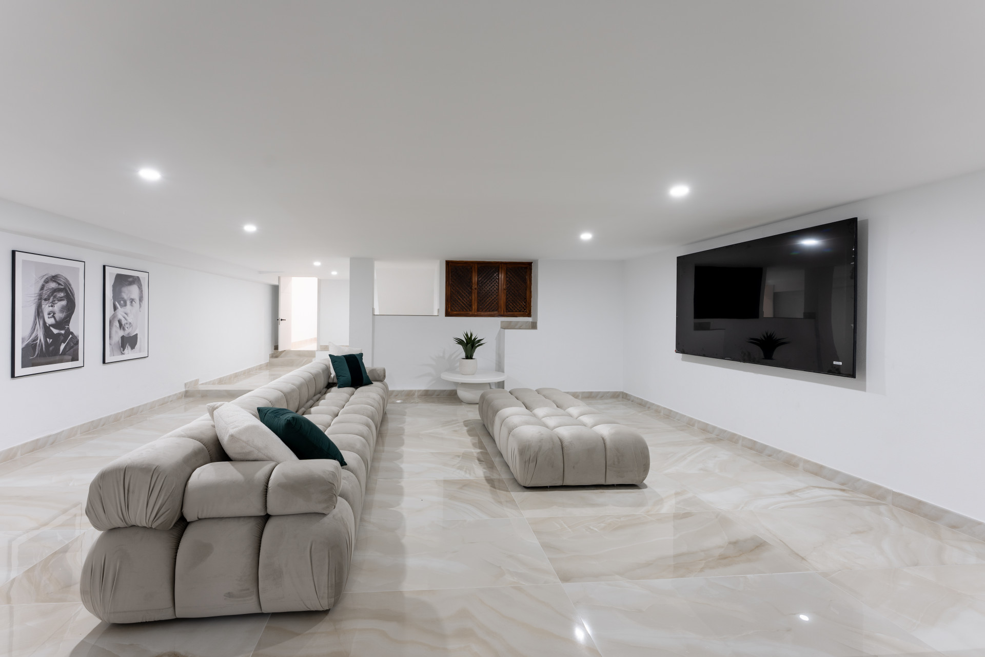 The townhouse spans a generous 301m², with 201m² of interior space and a 100m² terrace, providing ample room for relaxation and entertainment. It features four spacious bedrooms, including a luxurious en-suite, two additional bathrooms, and a guest toilet. The interior is elegantly appointed with marble floors, fitted wardrobes, and electric blinds, ensuring style and comfort. The fully equipped kitchen and the air-conditioned living areas are complemented by a cinema room and a games room, offering a perfect blend of leisure and functionality.