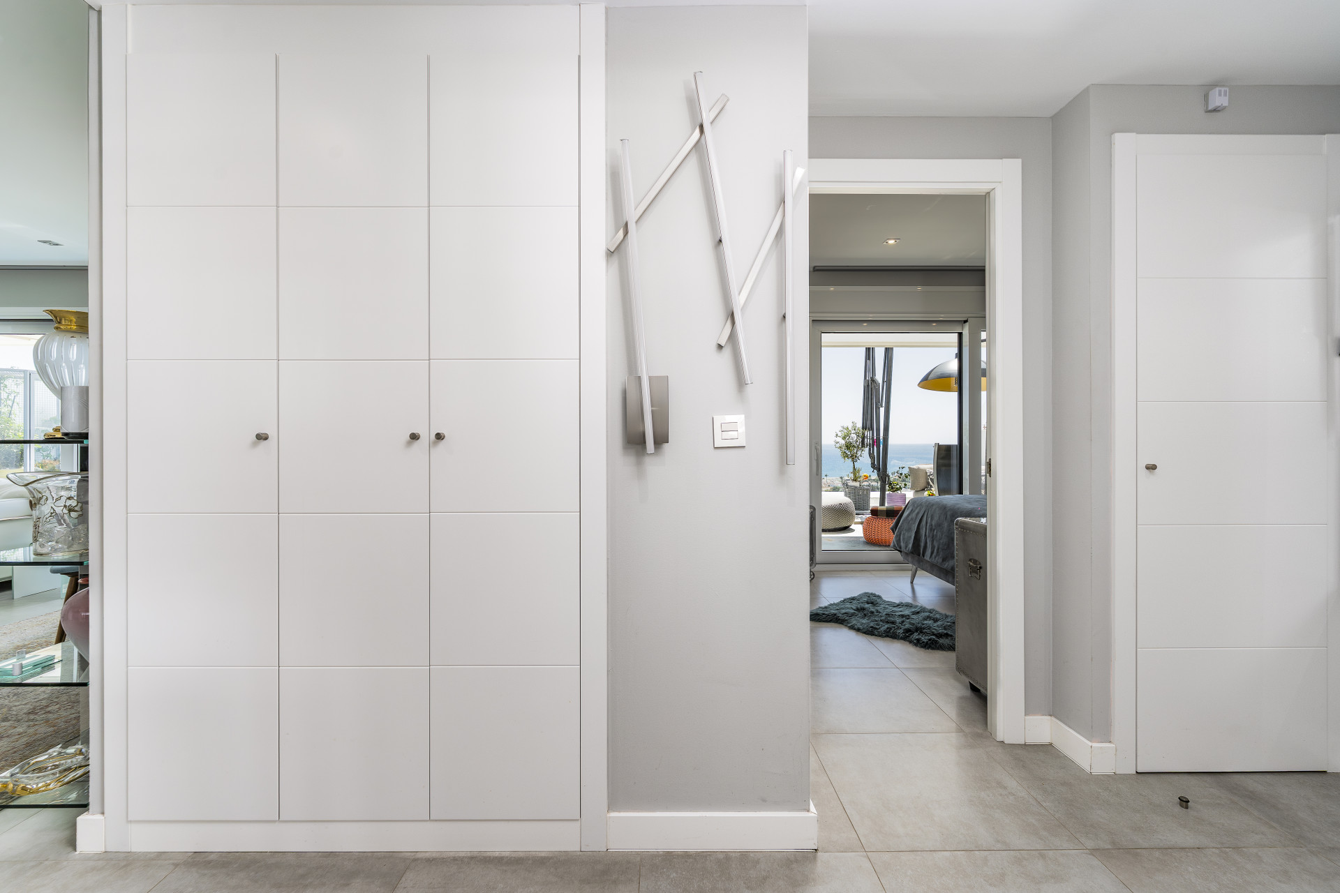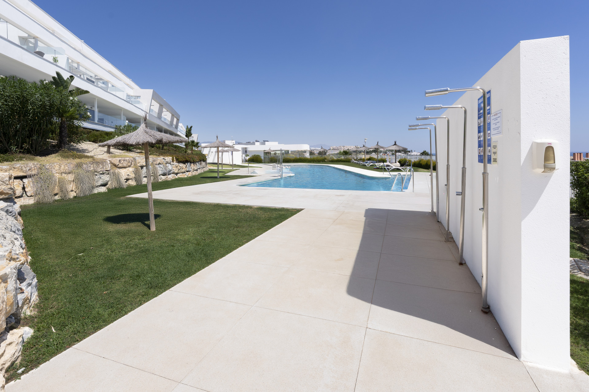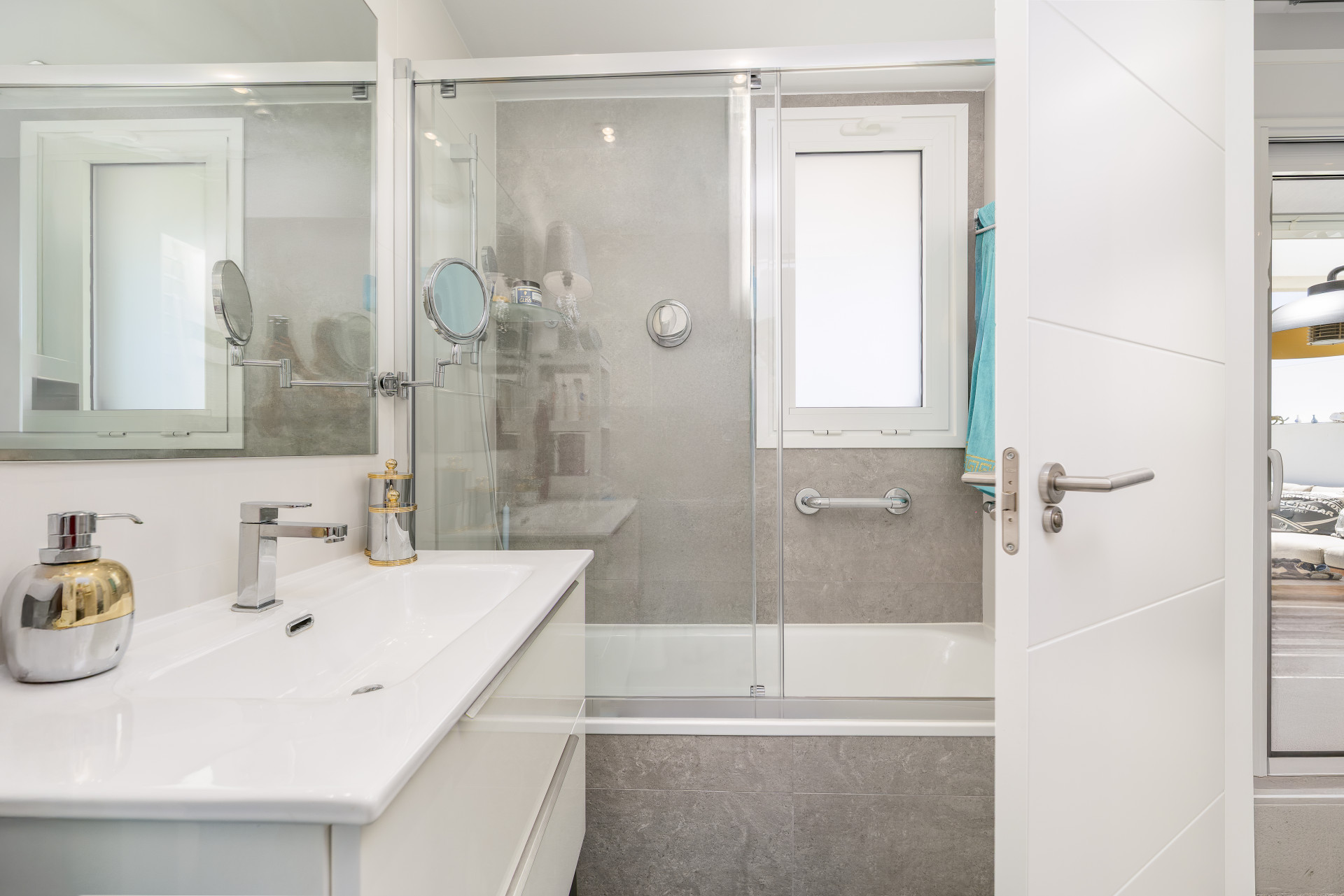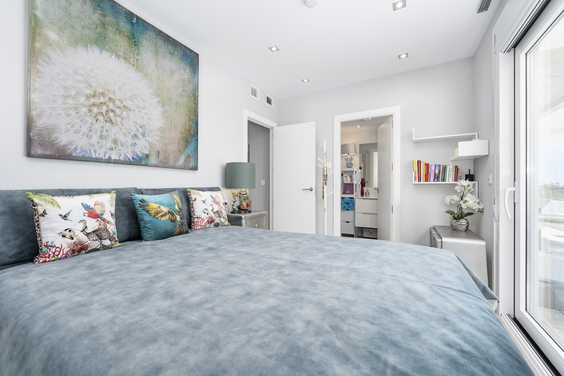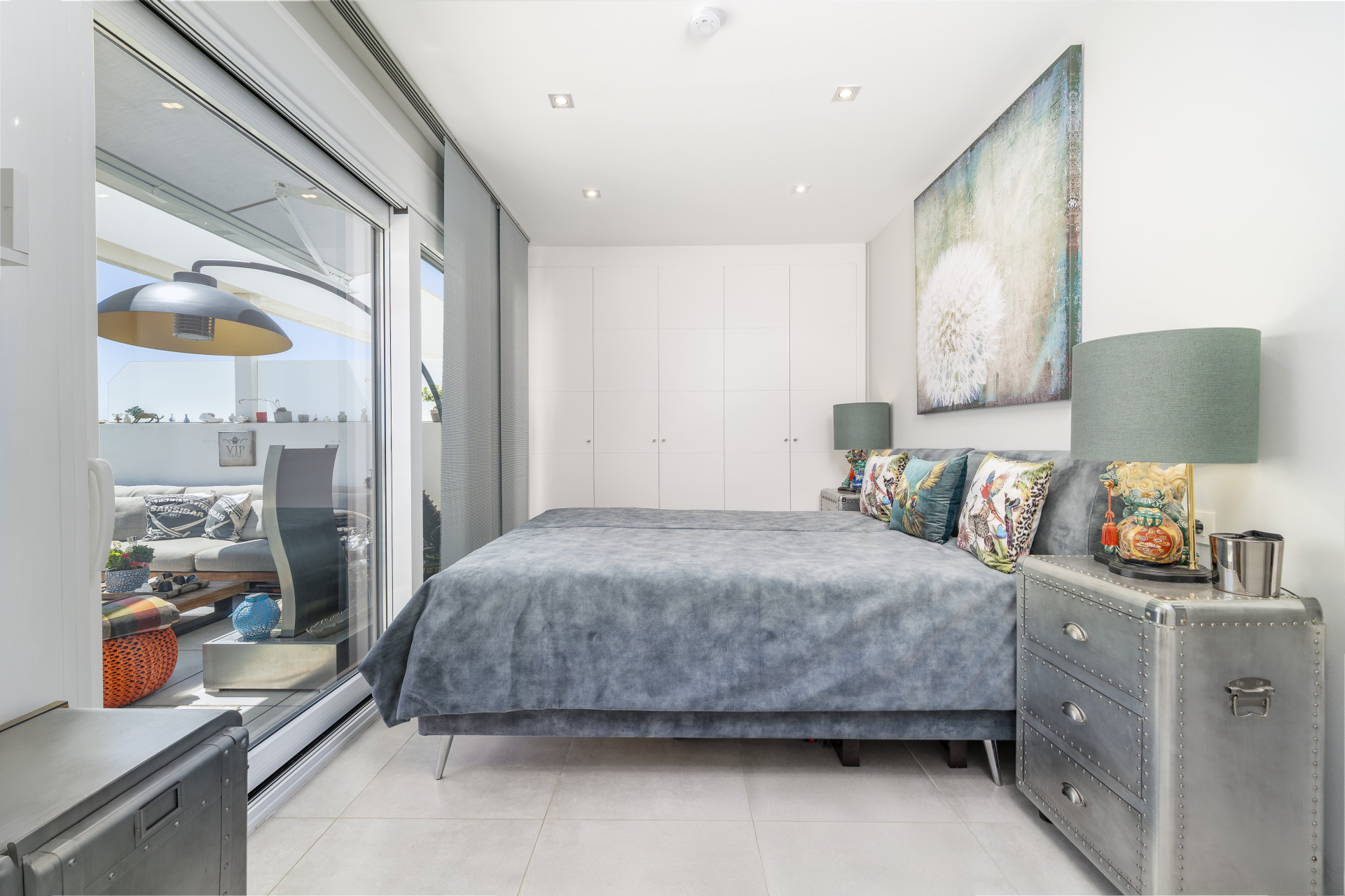 Das Hauptschlafzimmer verfügt über ein Bad en suite, große Einbauschränke sowie direkten Zugang zur Terrasse – so beginnen Sie den Tag mit Meerblick und frischer Brise. Das zweite Schlafzimmer liegt gegenüber und wird durch ein weiteres modernes Badezimmer ergänzt. Beide Bäder überzeugen durch elegante Armaturen und zeitgemäße Ausstattung.