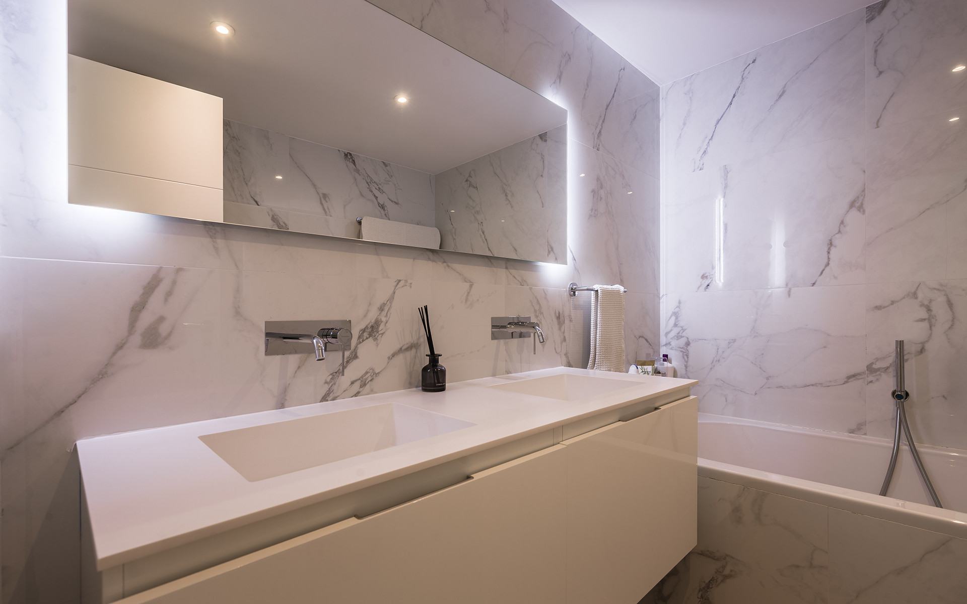 Die Wohnung verfügt über vier Schlafzimmer und drei voll ausgestattete Badezimmer mit zeitgemäßem Design. Ein zusätzliches Gäste-WC sorgt für Komfort und Praktikabilität für Besucher.