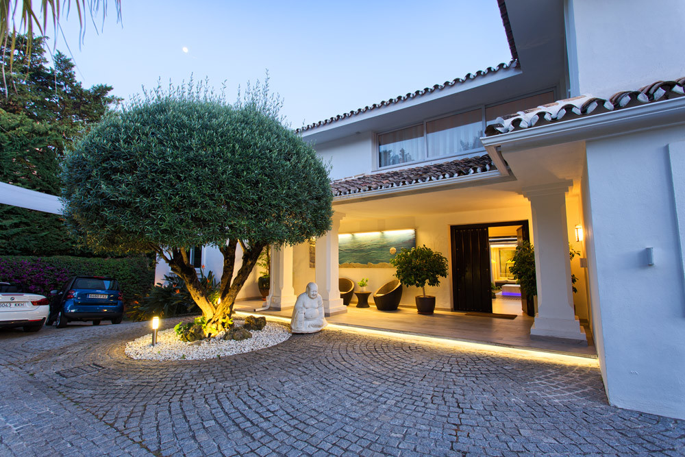 Entdecken Sie Luxus, Ruhe und Exklusivität in der Villa Samadhi, einer modernen andalusischen Villa im begehrten Viertel Nahueles, Marbella. Sehr privat und still, diese Eigenschaft gibt Ihnen das unmittelbare Gefühl, einen ganz besonderen Platz erreicht zu haben.