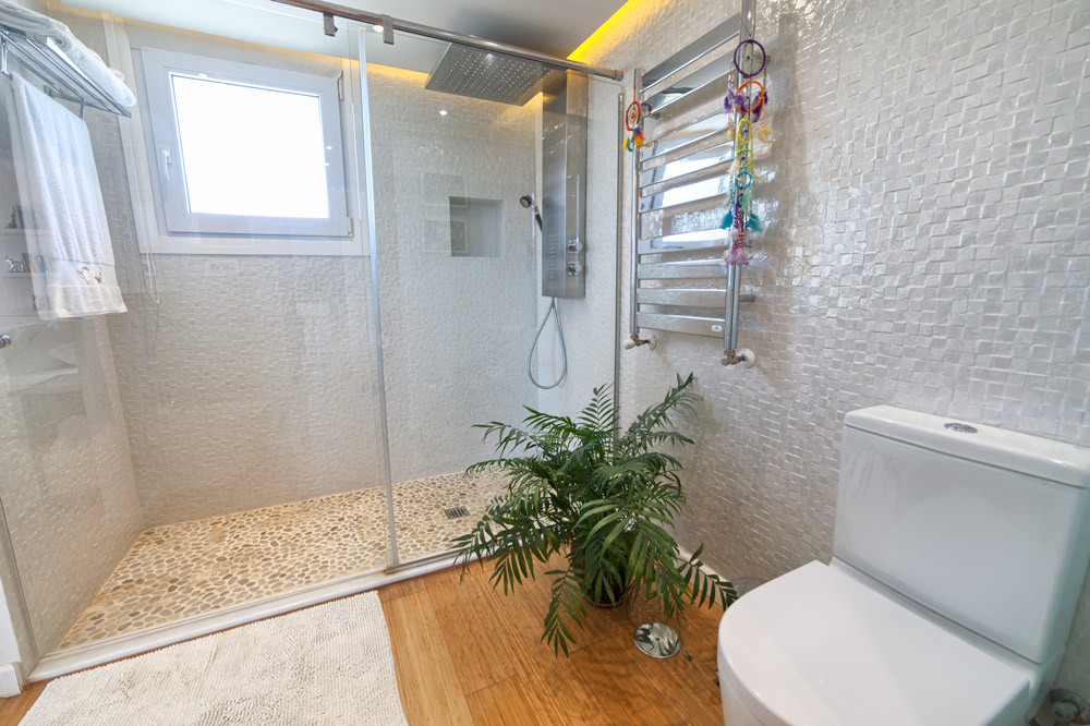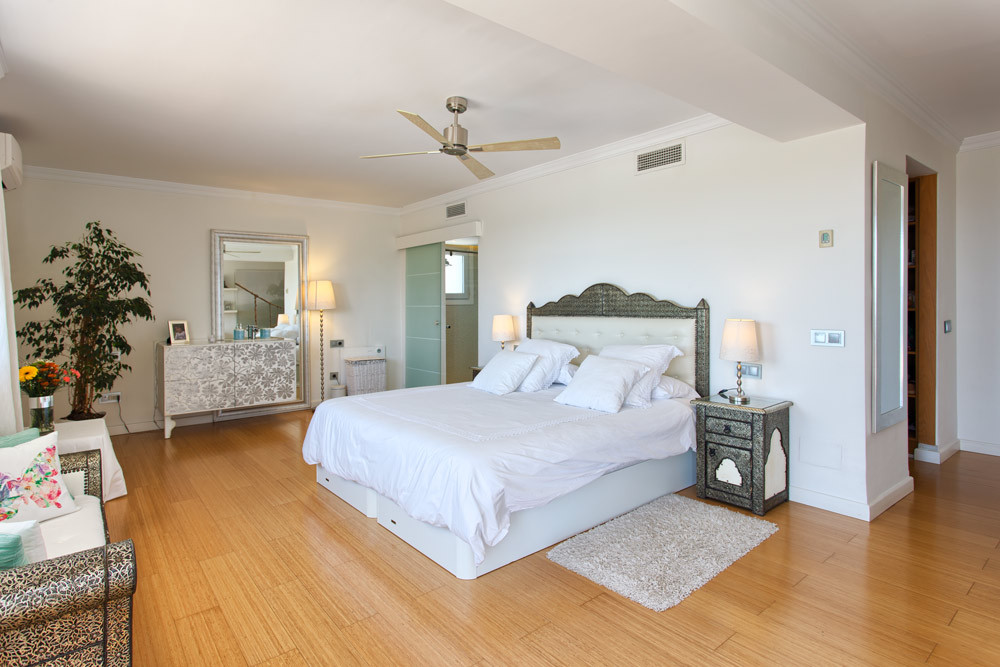 Im Obergeschoss genießen zwei Hauptschlafzimmer eine private Terrasse von 60 m2 mit Meerblick, Ankleideräume, Safe, Sauna und privatem Jacuzzi. Alle Badezimmer sind modernes Design mit bahnbrechender Dusche, Regeneffekt und separatem Doppelbad.
