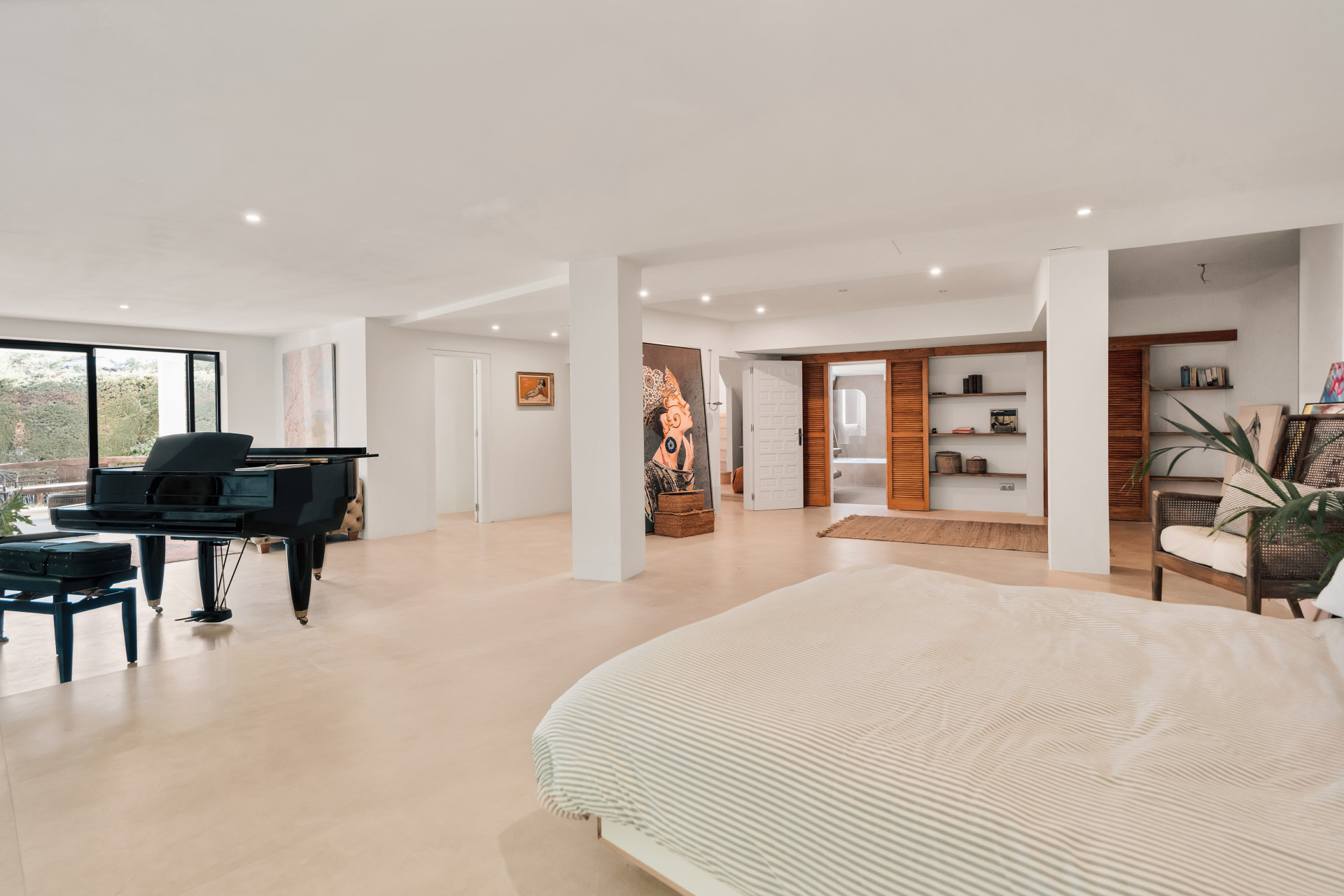 On the lower level are two more bedrooms, each with their own bathroom, and the current master suite, a beautiful open-plan room of approximately 100 m2 with grand piano and a lounge that connects with the garden. This room was designed in a way that it could easily be divided into two spacious individual bedroom suites. The house also has a garage and store room.