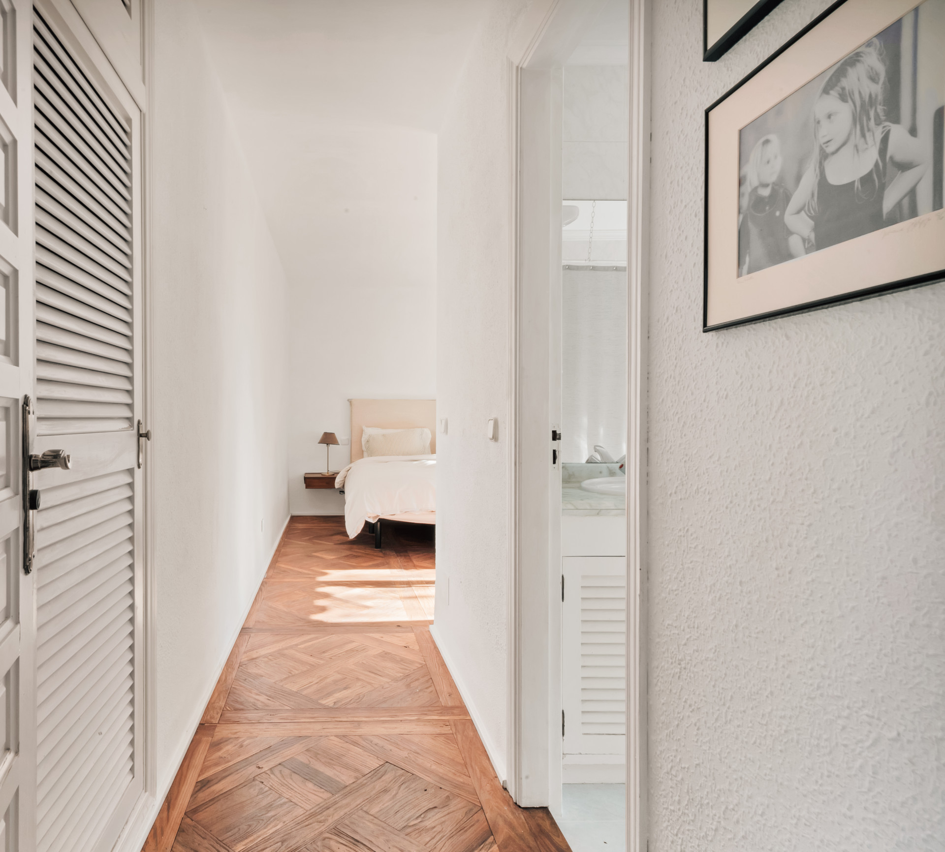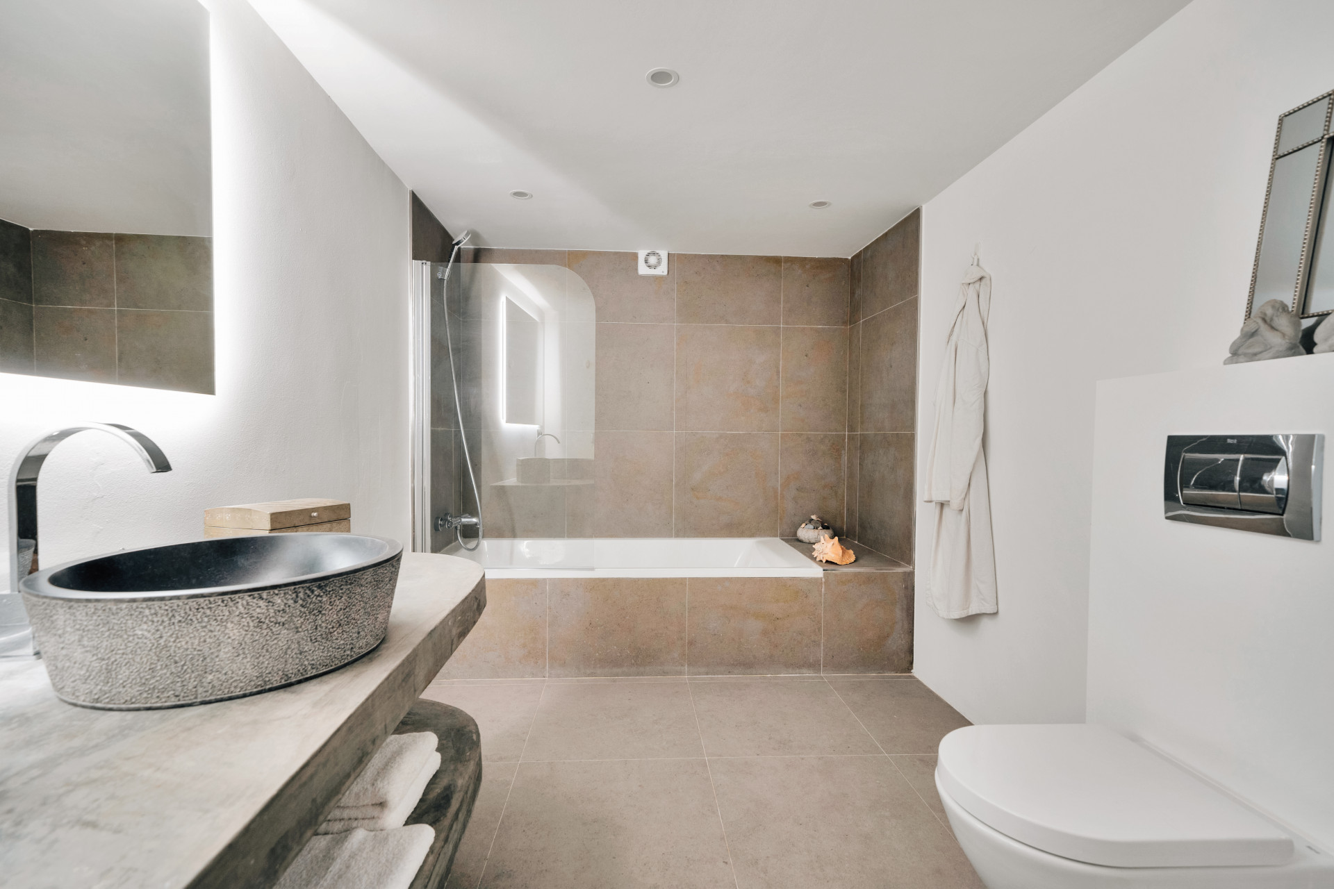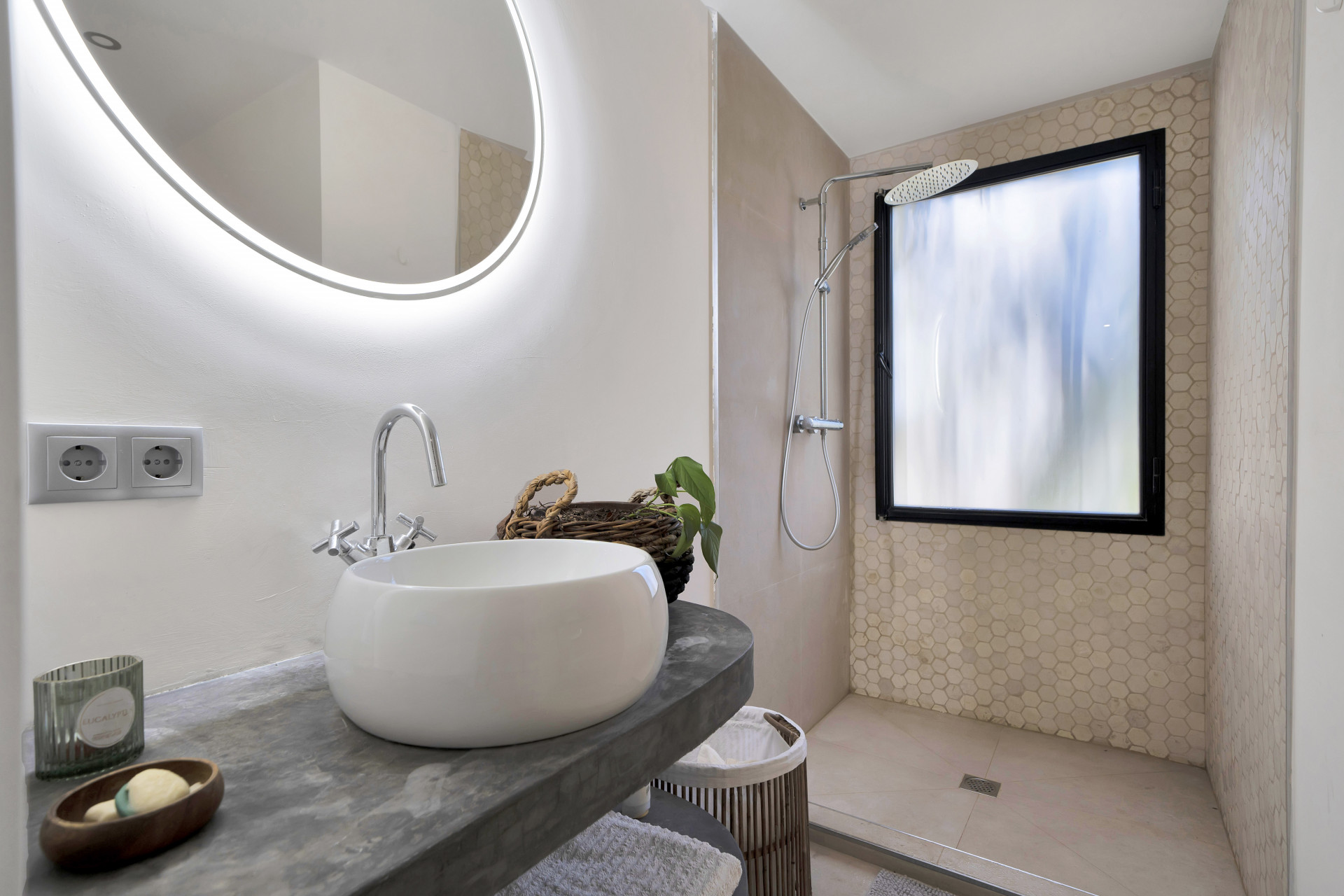 The main level contains a spacious, open-plan living area with modern kitchen, breakfast bar, a dining area, and the large lounge with open fire-place and beautiful, traditional Spanish vaulted ceiling. The black-framed floor-to-ceiling windows give a nice modern, industrial touch and lead to a covered terrace overlooking the pool. To the side of the house is the dreamy pergola or outdoor dining room, inviting to relax. On this level, we also have one double bedroom with a private terrace and en-suite bathroom, which could serve as the master suite, as well as a guest toilet.