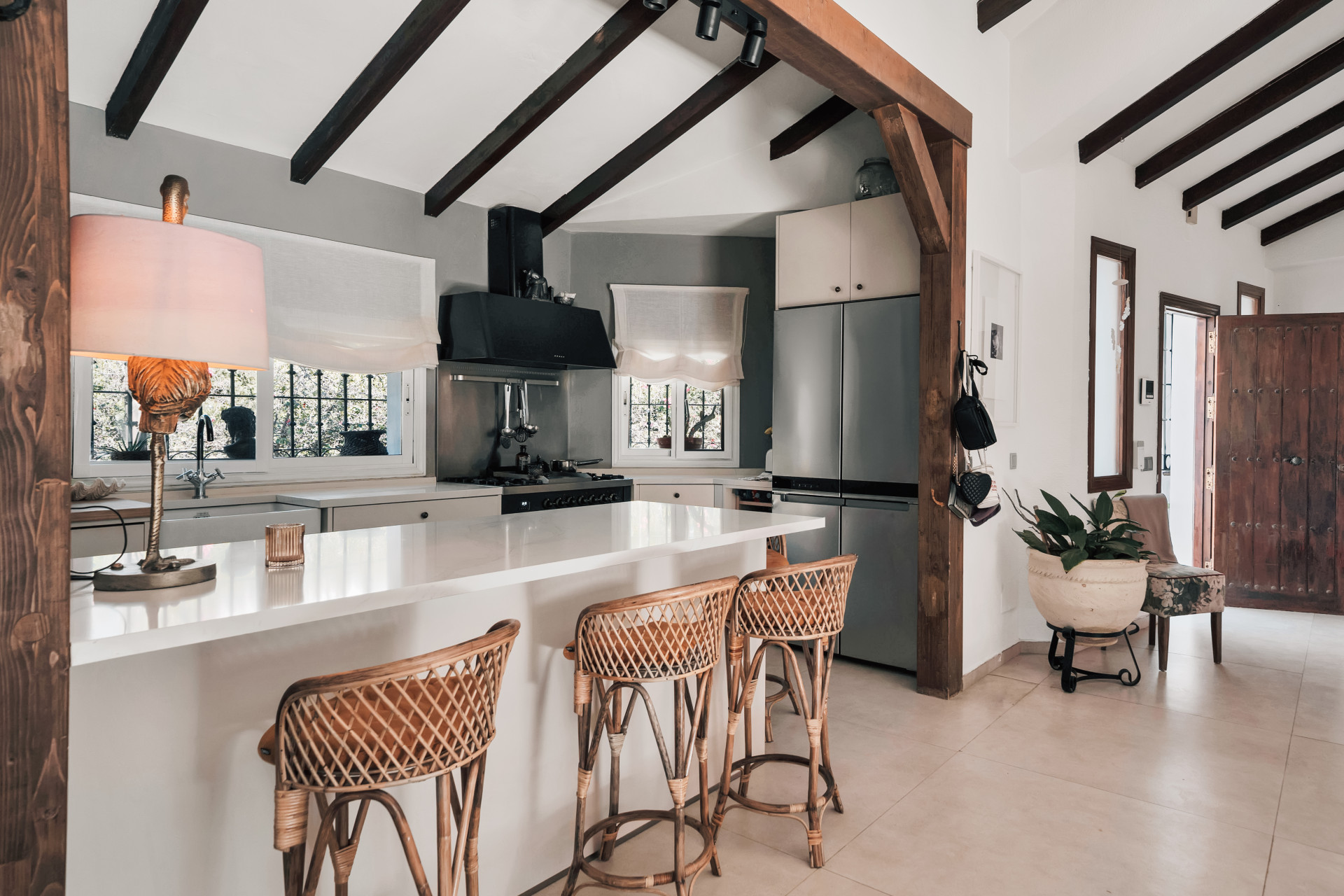 Beautiful, boho-chic family home! This enchanting Andalusian style villa was carefully renovated to bring you the perfect blend of modern comfort and classic Marbella charm. With its cascading bougainvillea, wooden beams, a dreamy pergola for late al-fresco lunches, and a tropical garden and pool, this house is a true oasis of tranquillity, yet only a stone’s throw away from the beach, San Pedro and Puerto Banus.