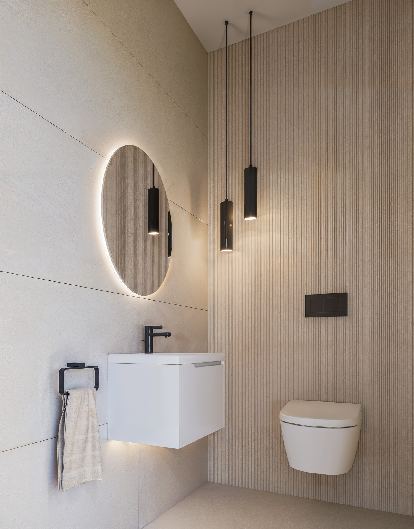 Auch die Badezimmer überzeugen mit modernster Ausstattung und zeitgemäßem Design. Hochwertige, raumhohe Porzellanfliesen, minimalistische Duschbereiche mit Glasabtrennungen vom Boden bis zur Decke sowie integrierte Waschbecken auf eleganten Waschtischen mit zwei Schubladen verbinden Funktionalität mit stilvoller Ästhetik. Hinterleuchtete Spiegel unterstreichen den modernen Charakter und sorgen für ein angenehmes Ambiente.