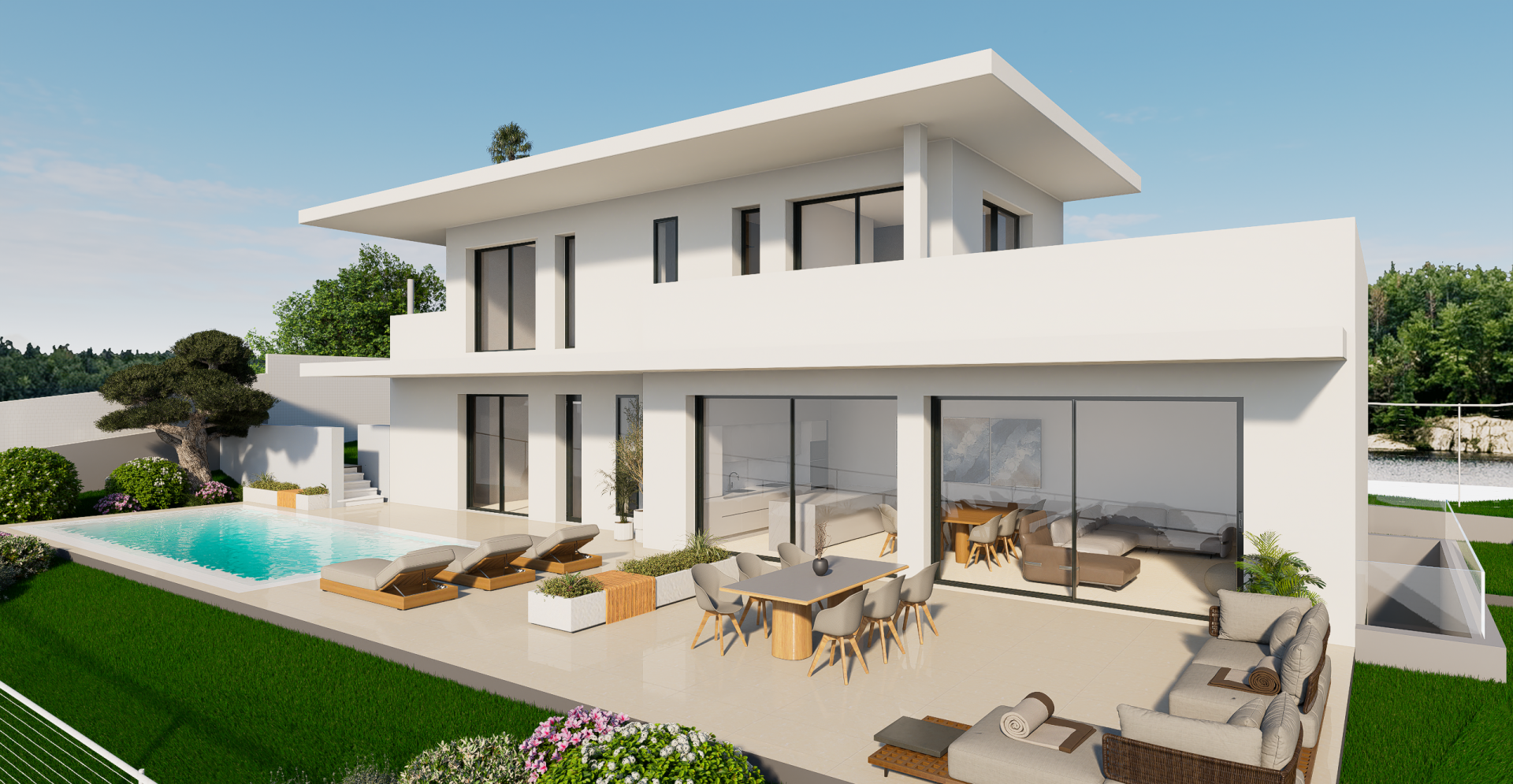 Die Schlafzimmer öffnen sich direkt auf Terrassen, auf denen Sie den liebevoll gestalteten Garten und den eigenen Pool genießen können – ganz privat oder gemeinsam mit Familie und Freunden. Zudem stehen ausreichend überdachte und private Parkmöglichkeiten zur Verfügung.