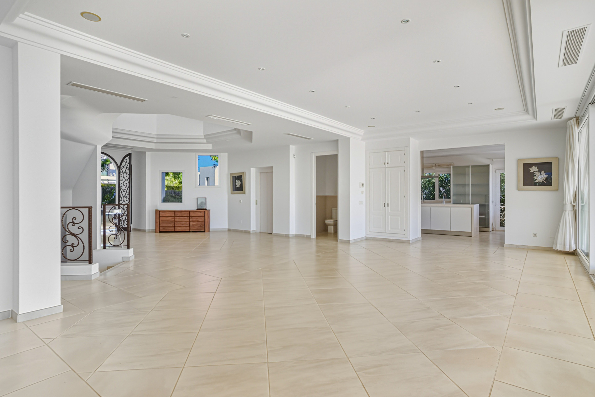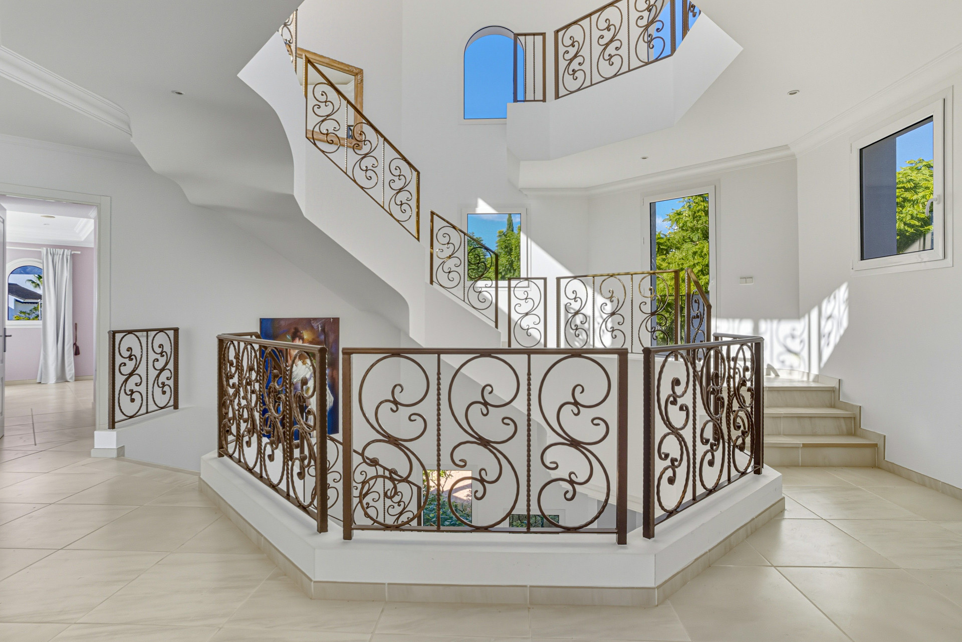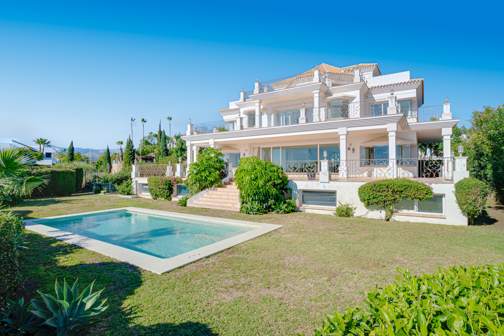 Außergewöhnliche Acht-Zimmer-Villa in Südlage in der angesehenen Wohnanlage von Los Flamingos, Benahavis, bietet 24-Stunden-Sicherheit, einen privaten Garten und einen privaten Pool, alle in unmittelbarer Nähe zu Annehmlichkeiten. Diese bemerkenswerte Residenz empfängt Sie mit einer großartigen Eingangshalle, die spektakuläre Ausblicke auf das Meer bietet. Die Villa verfügt über zwei elegante Wohnzimmer, eine große Küche mit Utility-Zimmer, dreifache Garage und Aufzug, die alle Etagen verbindet. Die Master-Suite verfügt über sein und ihr Badezimmer und begehbare Schränke, während alle drei Schlafzimmer im ersten Stock direkten Zugang zu einer geräumigen Terrasse mit Blick auf das Meer genießen. Jedes Schlafzimmer ist en suite, ergänzt durch drei zusätzliche Gäste-WCs. Die vielseitige untere Ebene bietet enormes Potenzial, mit zahlreichen anpassbaren Zimmern und unabhängigem Zugang von der Garage, so dass es ideal für die Schaffung einer eigenen Wohnung. Dieses außergewöhnliche Anwesen bietet eine perfekte Mischung aus Luxus, Raum und endlosen Möglichkeiten.