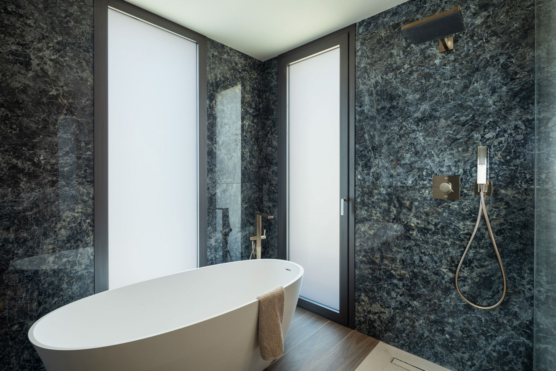 Im gesamten Haus überzeugen hochwertige Materialien und edle Details: Eine Designerküche von Modulnova, elegante Schüco-Aluminiumfenster mit einer Höhe von bis zu 2,5 m, sowie eine beleuchtete Pivot-Eingangstür setzen architektonische Akzente.