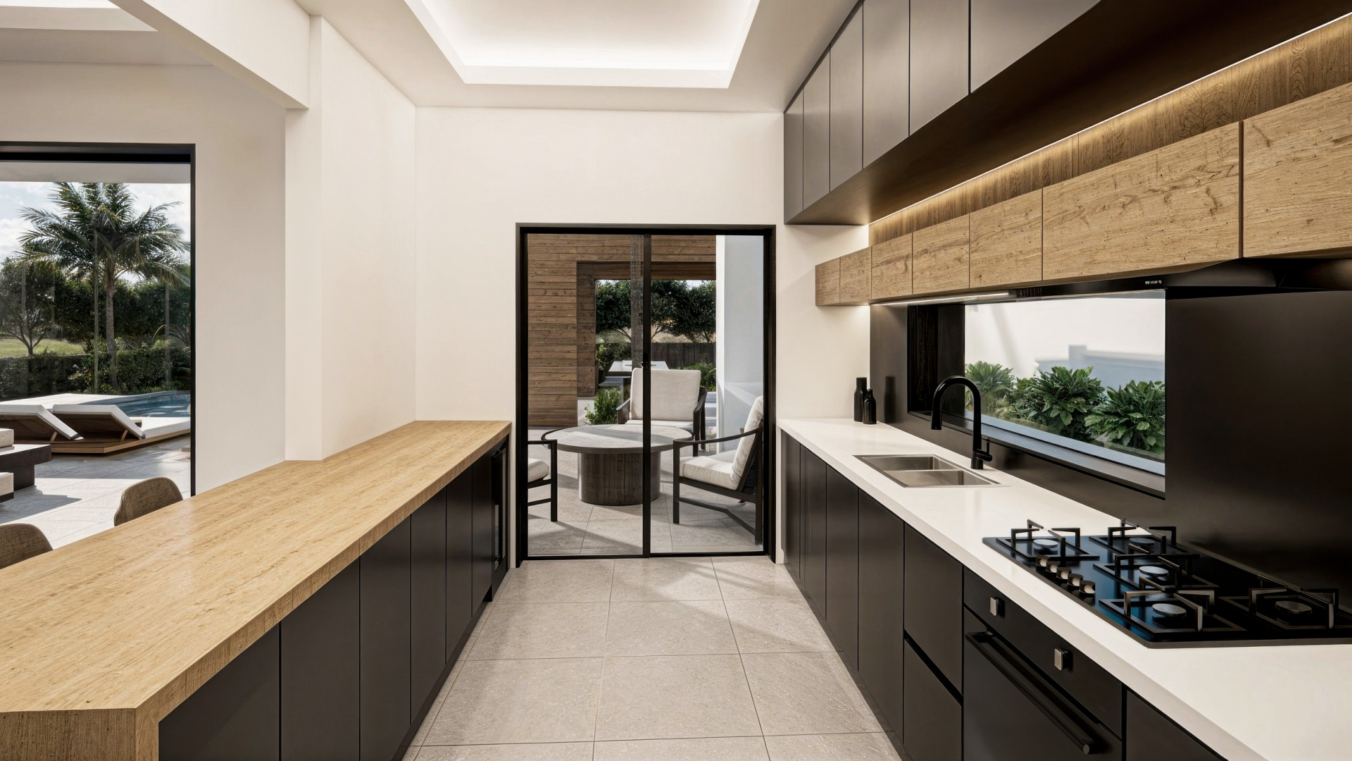 Hochwertige, moderne Küche mit Premiumgeräten und versteckter Speisekammer