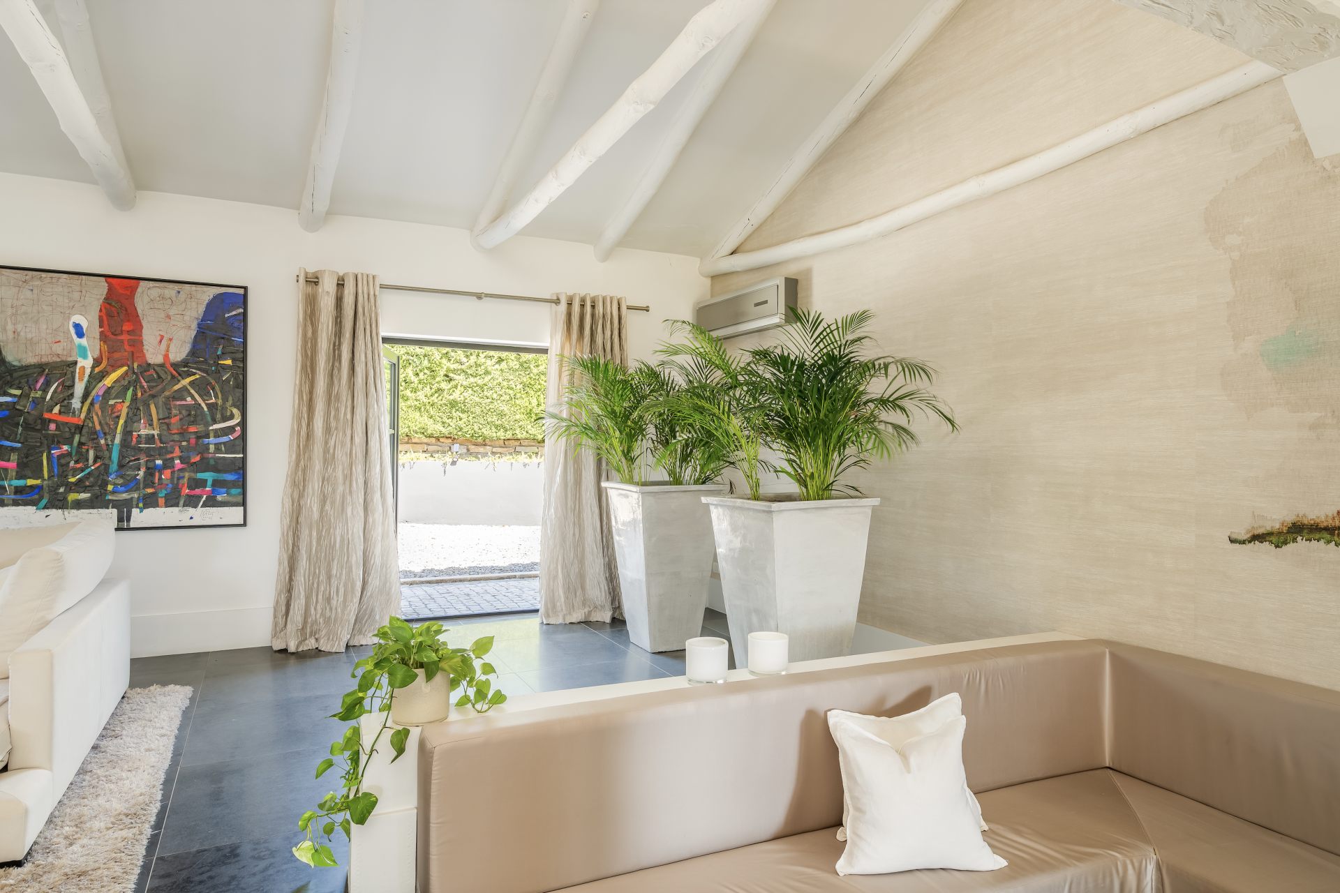 Die 2006 renovierte Immobilie verfügt über eine helle, offene Küche mit zwei zentralen Inseln, Hauswirtschaftsraum und direktem Zugang zu den Terrassen und dem Garten. Großzügige Wohn- und Essbereiche werden durch zwei Kamine, darunter ein beeindruckender beidseitiger Kamin, aufgewertet und öffnen sich über hochwertige römische Clavero-Fenster und Türen zur Hauptterrasse – perfekt für ein fließendes Wohngefühl zwischen Innen- und Außenbereich. Die hohen Gewölbedecken mit Holzträgern schaffen eine besonders gemütliche Atmosphäre.