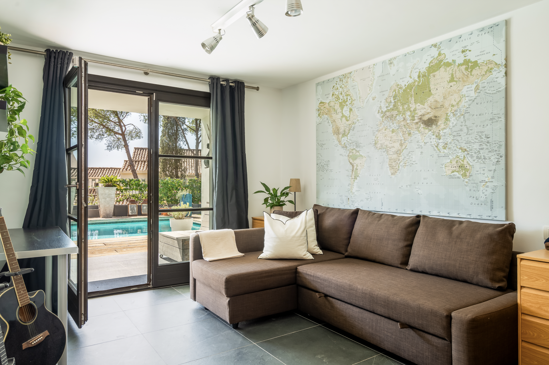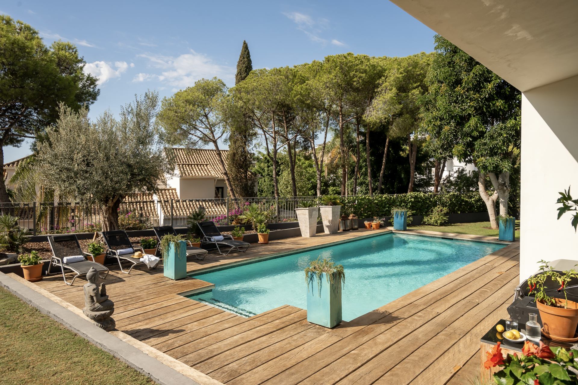 Das 1.600 m² große Grundstück umfasst einen großzügigen Swimmingpool, gepflegte Gärten mit Obstbäumen, überdachte Lounge-Bereiche und zahlreiche Terrassen, die Sonnen- und Schattenplätze den ganzen Tag über bieten.