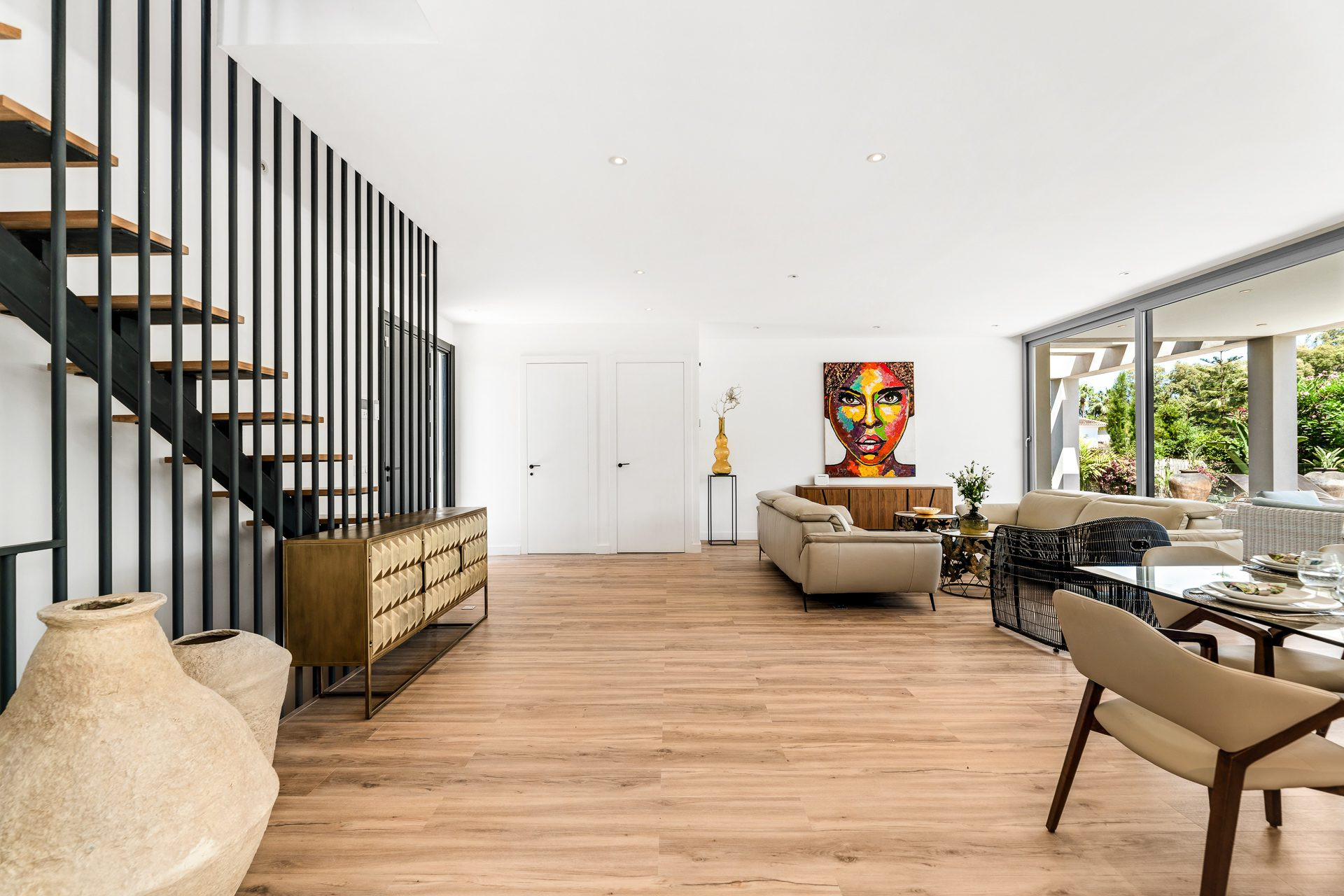 Highlights der Villa sind lichtdurchflutete, offene Wohnbereiche, eine Designerküche, großzügige Terrassen, ein liebevoll gestalteter Garten mit Pool sowie elegante Suiten auf jeder Etage. Die Südausrichtung und der fließende Übergang zwischen Innen- und Außenbereichen schaffen das perfekte Ambiente für den ganzjährigen Marbella-Lifestyle. Eine komplette Glasfassade verbindet Wohnzimmer und Terrasse nahtlos und sorgt dafür, dass Sie im Sommer im Schatten speisen und im Winter die Sonne genießen können – umgeben von einem wunderschön beleuchteten Garten. Loungemöbel zwischen blühenden Pflanzen laden zum Entspannen und Genießen ein.
