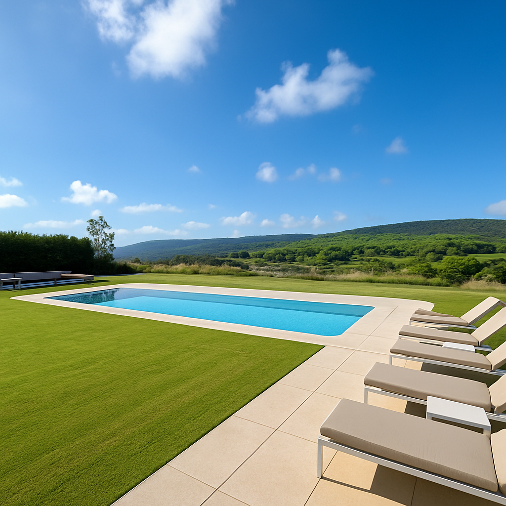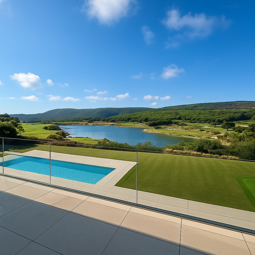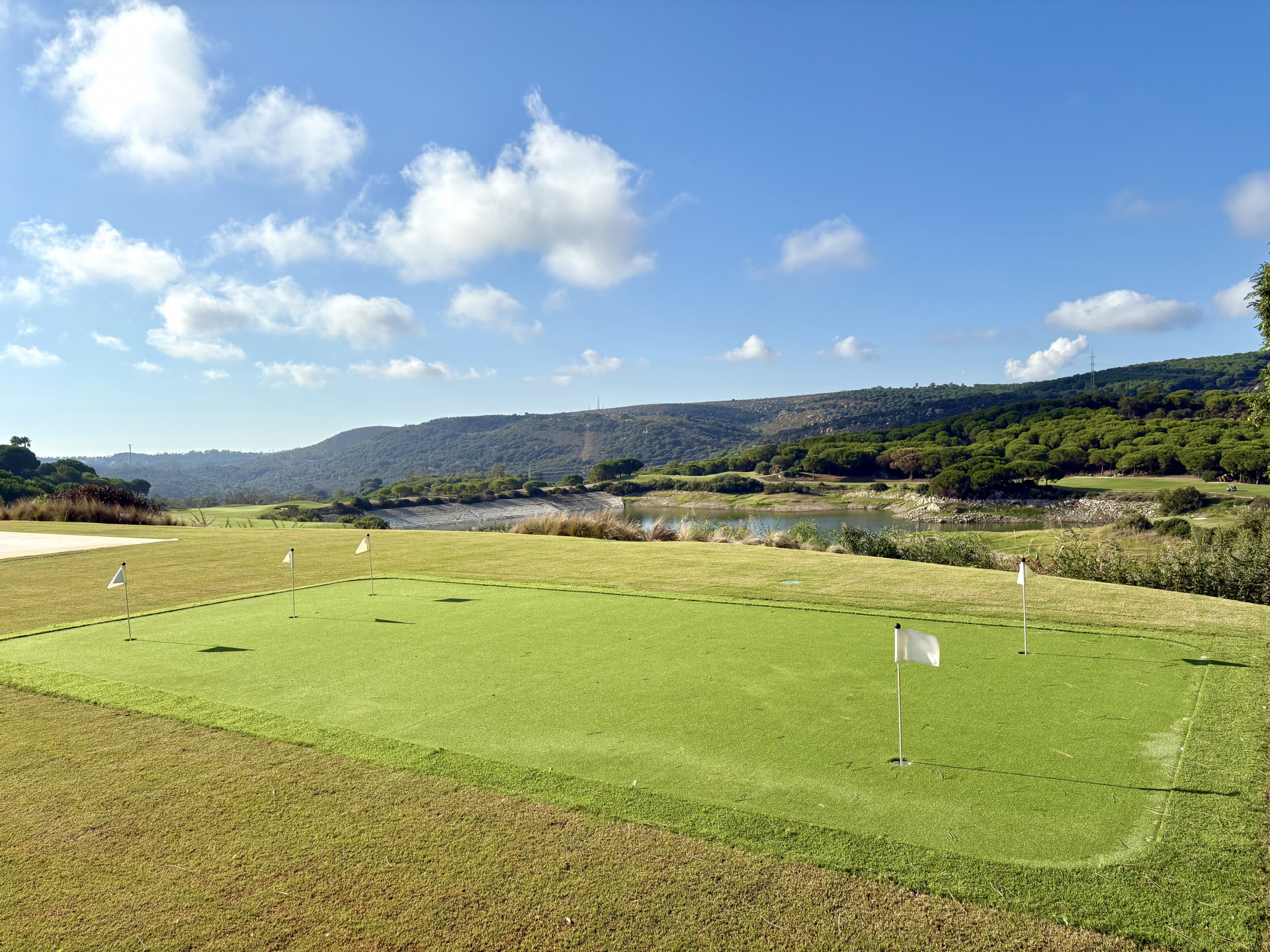 Das Außengelände lädt zum Entspannen und Genießen ein, mit einem privaten Swimmingpool, einer Feuerstelle für gemütliche Abende und einem hochwertigen Putting Green, eingebettet in einen wunderschön gepflegten Garten, der direkt an den Golfplatz grenzt.