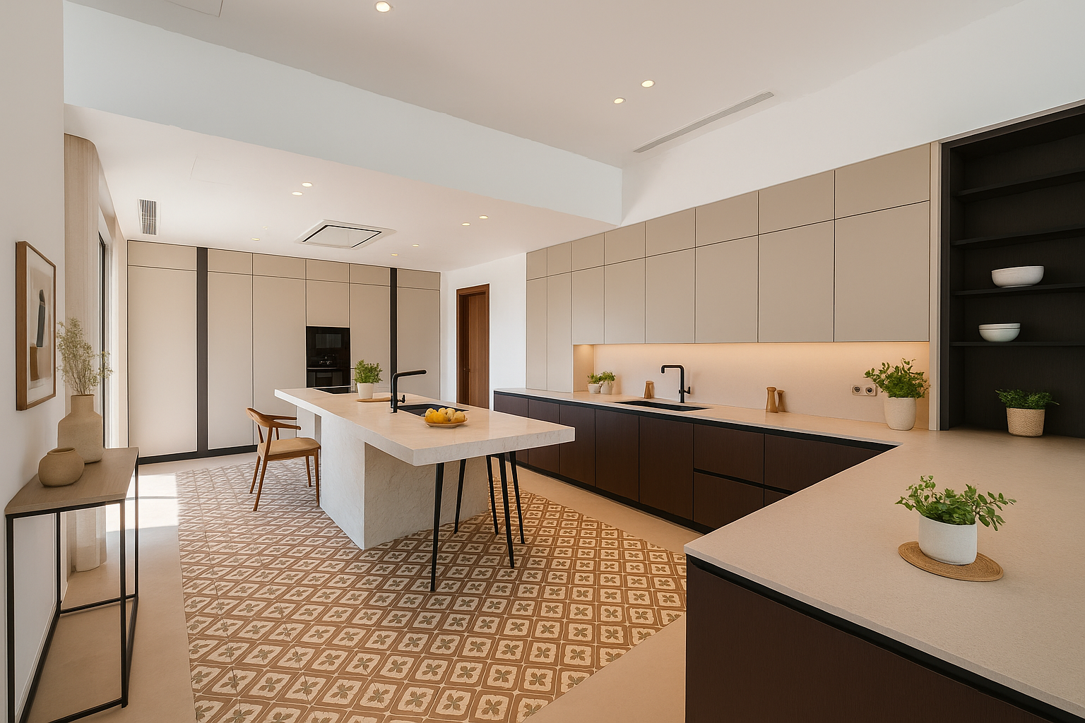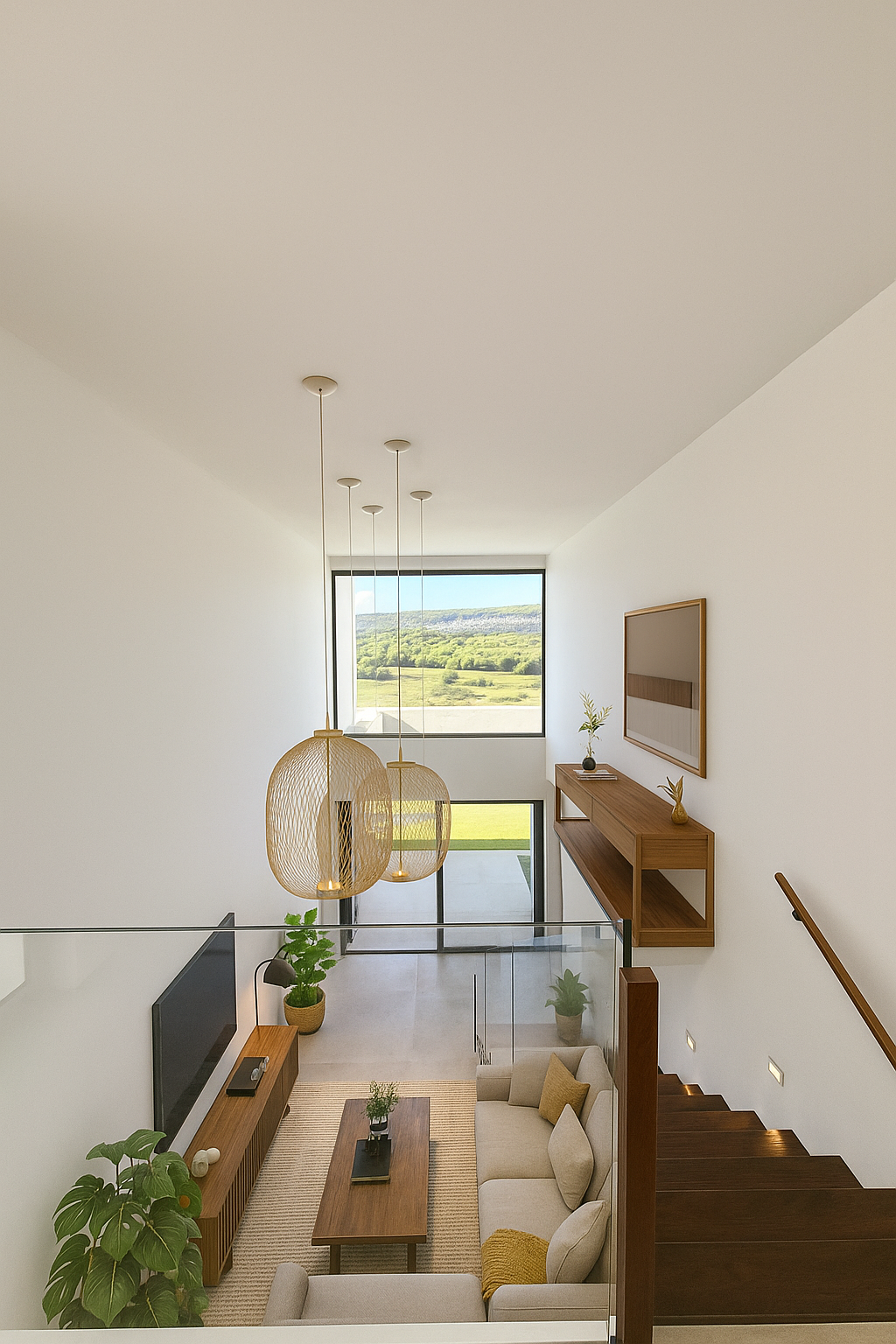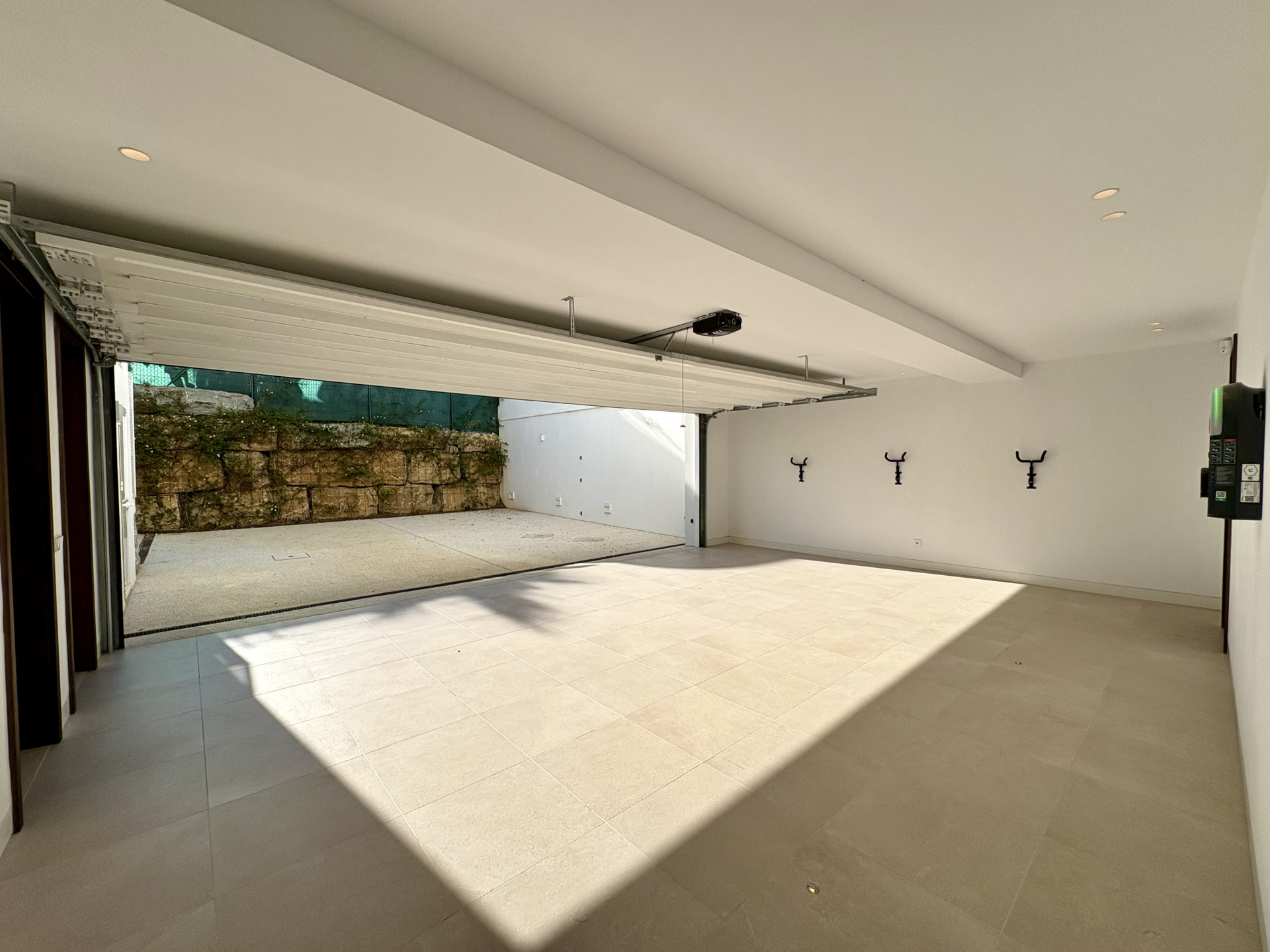 Die Residenz verfügt über fünf großzügige Schlafzimmer-Suiten, die jeweils auf Privatsphäre und Ruhe ausgelegt sind. Im Zentrum des Hauses liegt das helle, weitläufige Wohnzimmer, das nahtlos auf die Terrassen und den gepflegten Garten übergeht und so ein perfektes Zusammenspiel von Innen- und Außenbereichen schafft. Die separate Küche mit Essbereich, ausgestattet mit modernsten Geräten und edlen Materialien, bildet den idealen Rahmen für das Familienleben ebenso wie für die Bewirtung von Gästen.