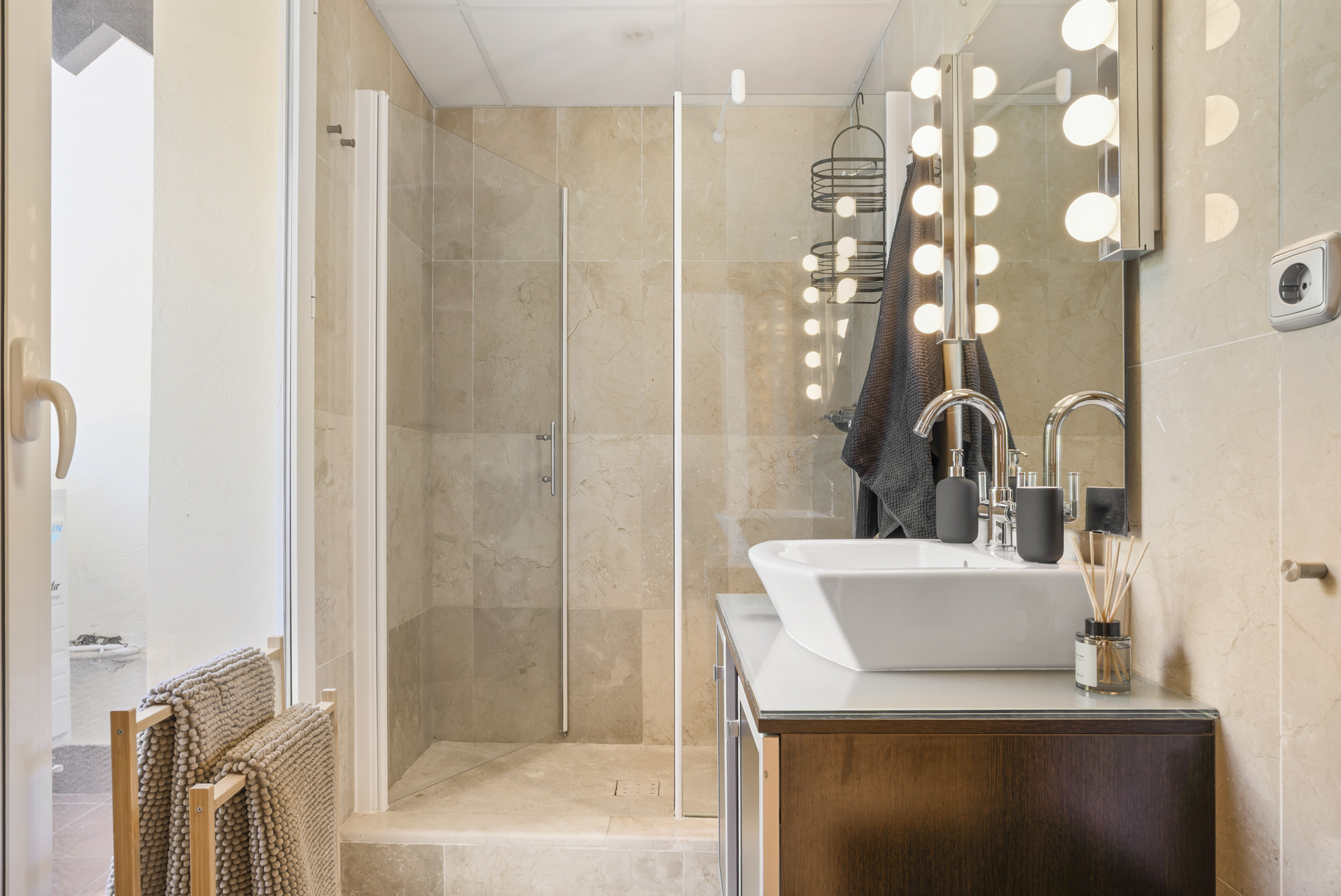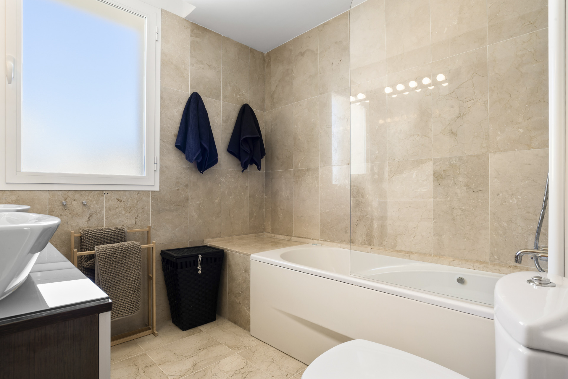 All three bedrooms are bright and inviting, featuring comfortable layouts and large windows that frame views of greenery and distant mountains. The bathrooms are finished in refined marble with modern fixtures, including a double vanity and a spacious bathtub, offering a spa-like touch. Each detail has been thoughtfully considered to provide an elegant yet practical living environment.