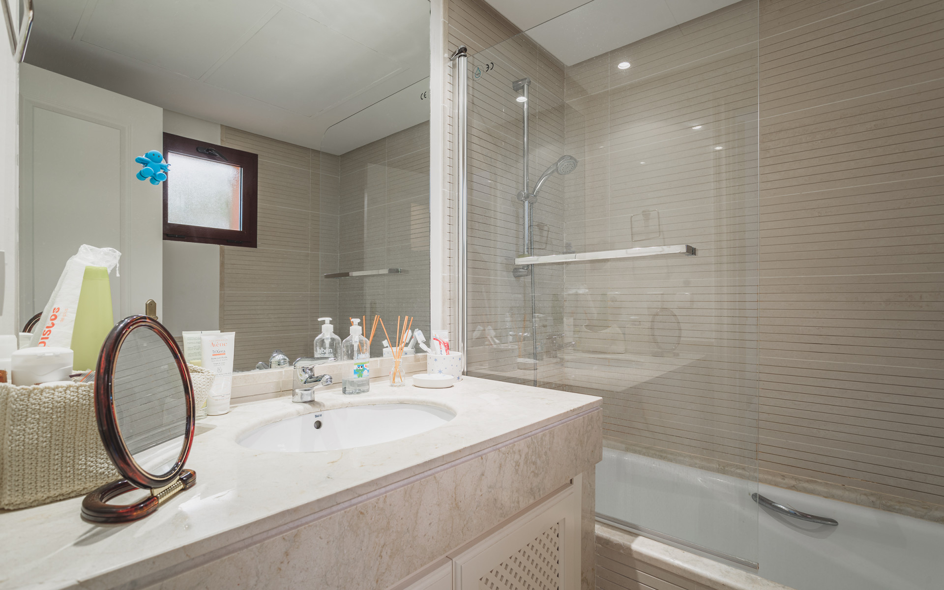 Bathed in natural light, the apartment features a generous living and dining area with working fireplace, that opens onto a partially covered terrace with panoramic views across the Mediterranean, Gibraltar, and Africa; a fully equipped, independent kitchen with ample workspace and well compartmented spacious cabinets; two generous sized en-suite double bedrooms with fitted wardrobes and with the master enjoying direct terrace access; as well as a guest toilet that adds convenience for visiting friends and family.