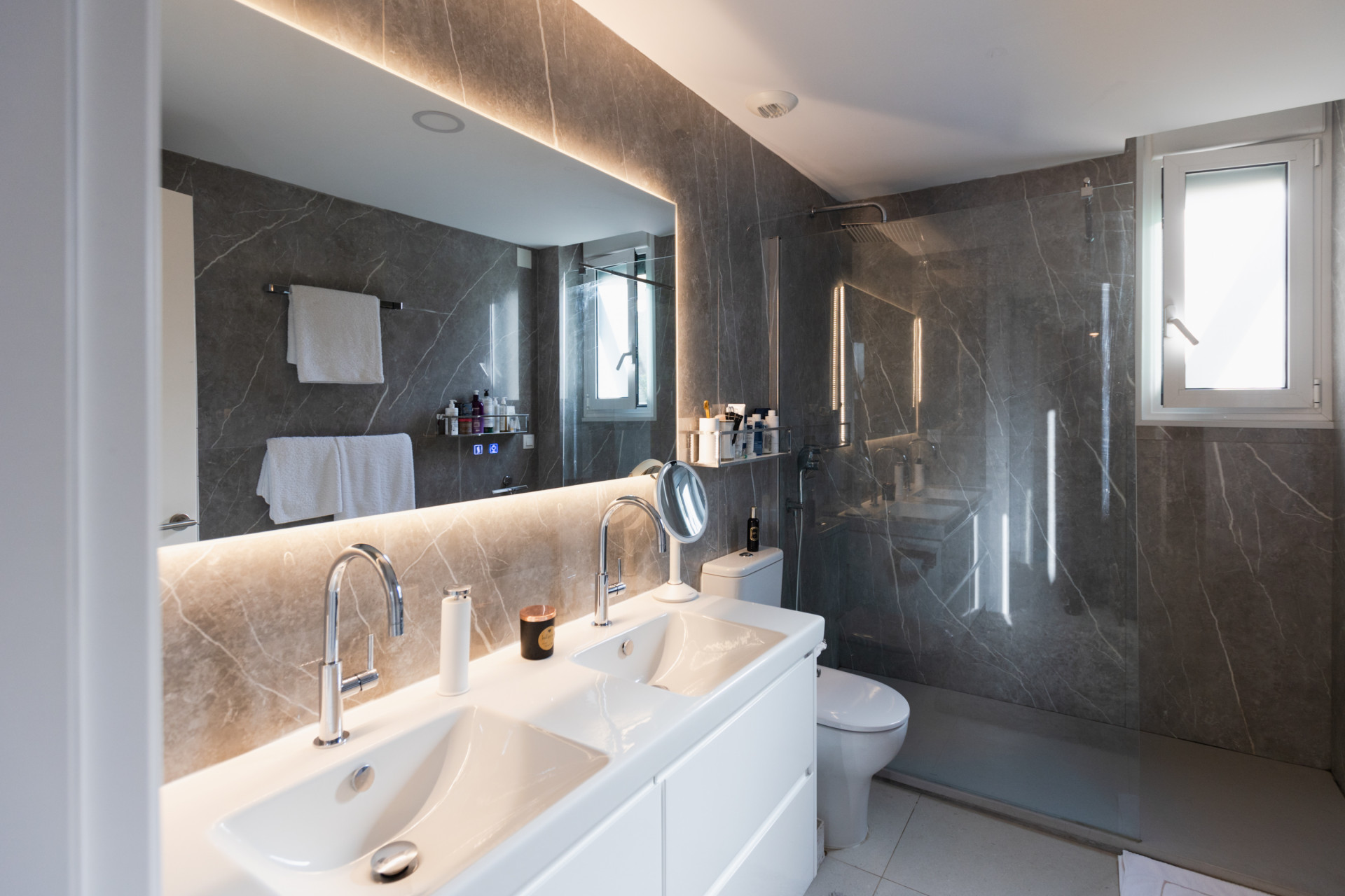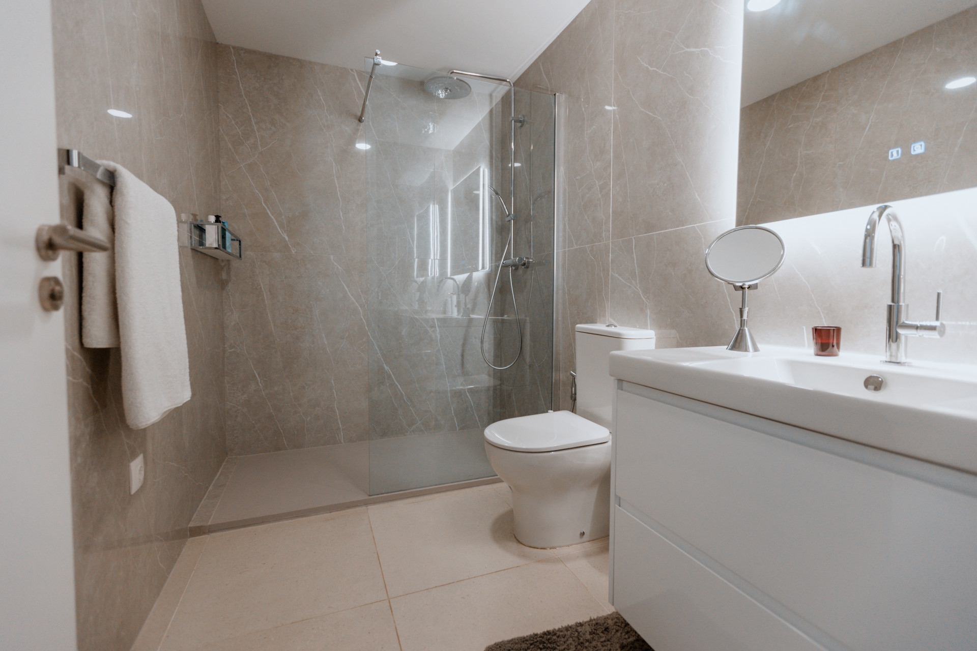Die Immobilie verfügt über drei großzügige Schlafzimmer mit jeweils eigenem Bad, alle mit Einbauschränken, sowie ein elegantes Gäste-WC. Sämtliche Bäder sind mit Materialien höchster Qualität ausgestattet, darunter Marmorböden und -fliesen, Spiegel mit Antibeschlagsystem sowie moderne Hand-Bidet-Sets.