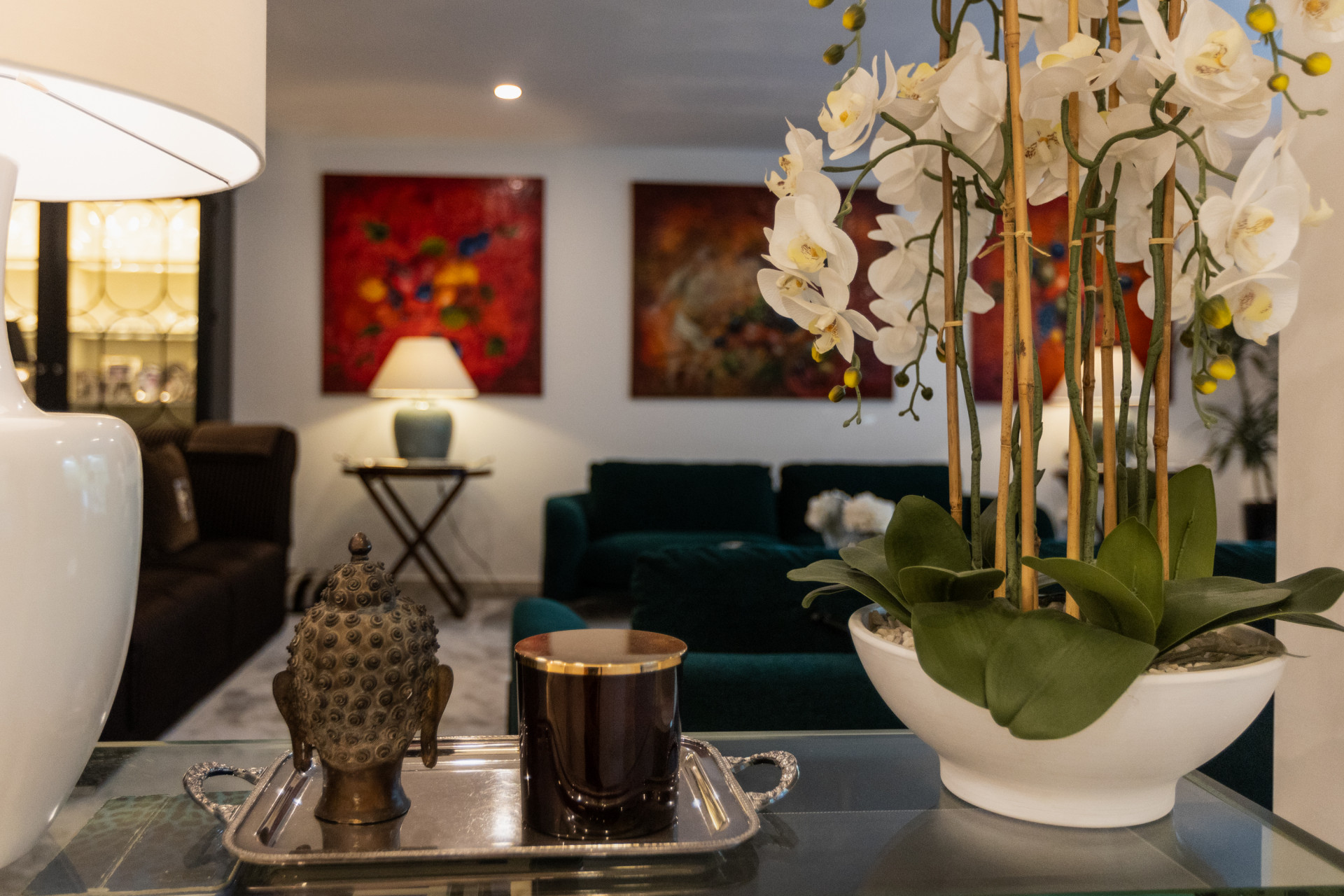 Im Mittelpunkt der Wohnung steht ein heller Wohn- und Essbereich mit offener Küche. Bodentiefe Fenster verbinden den Innenraum nahtlos mit dem privaten Garten und den großzügigen Terrassen, wodurch die Räume den ganzen Tag über mit natürlichem Licht durchflutet werden und herrliche Ausblicke auf den Korkeichenwald eröffnen.