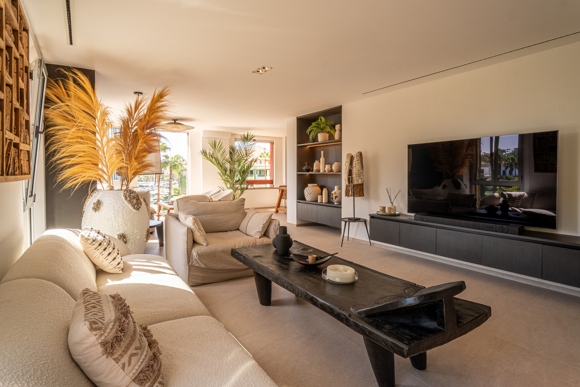 Dieses Apartment mit drei Schlafzimmern befindet sich in der beliebten Wohnanlage Ribera de la Romana in Sotogrande Marina, nur wenige Gehminuten vom Hafen mit seinen Restaurants, Geschäften und dem Strand von Sotogrande entfernt. Die Wohnung wurde mit viel Liebe zum Detail und hochwertigen Oberflächen komplett renoviert. Geräumig und offen gestaltet, verfügt die Wohnung über insgesamt 211 Quadratmeter. Der helle Eingangsbereich wirkt einladend und öffnet sich zum großzügigen Wohnbereich mit stilvollem Ölkamin. Im vorderen Bereich befindet sich ein weiterer Wohn- und Essbereich, der durch die komplett zu öffnenden Fenster lichtdurchflutet ist und einen fantastischen Blick auf den Yachthafen von Sotogrande bietet. Die neue, hochwertige Einbauküche ist zum Essbereich hin offen und verfügt über eine hochwertige technische Ausstattung, wie z.B. Smeg Geräte der Dolce & Gabbana Linie. Die Wohnung verfügt über drei Schlafzimmer, alle mit Einbauschränken und eigenem Bad. Ein besonderes Highlight ist das geräumige Hauptschlafzimmer, das über einen begehbaren Kleiderschrank mit Glastüren und indirekter Beleuchtung sowie ein offenes Badezimmer mit großer begehbarer Dusche und schwebender Badewanne verfügt. Alles in der Wohnung ist von höchster Qualität und wird komplett möbliert verkauft. Zur weiteren Ausstattung gehören eine neue Daikin-Klimaanlage, ein spezielles indirektes Beleuchtungssystem in der gesamten Wohnung, ein Abstellraum und ein Tiefgaragenstellplatz.